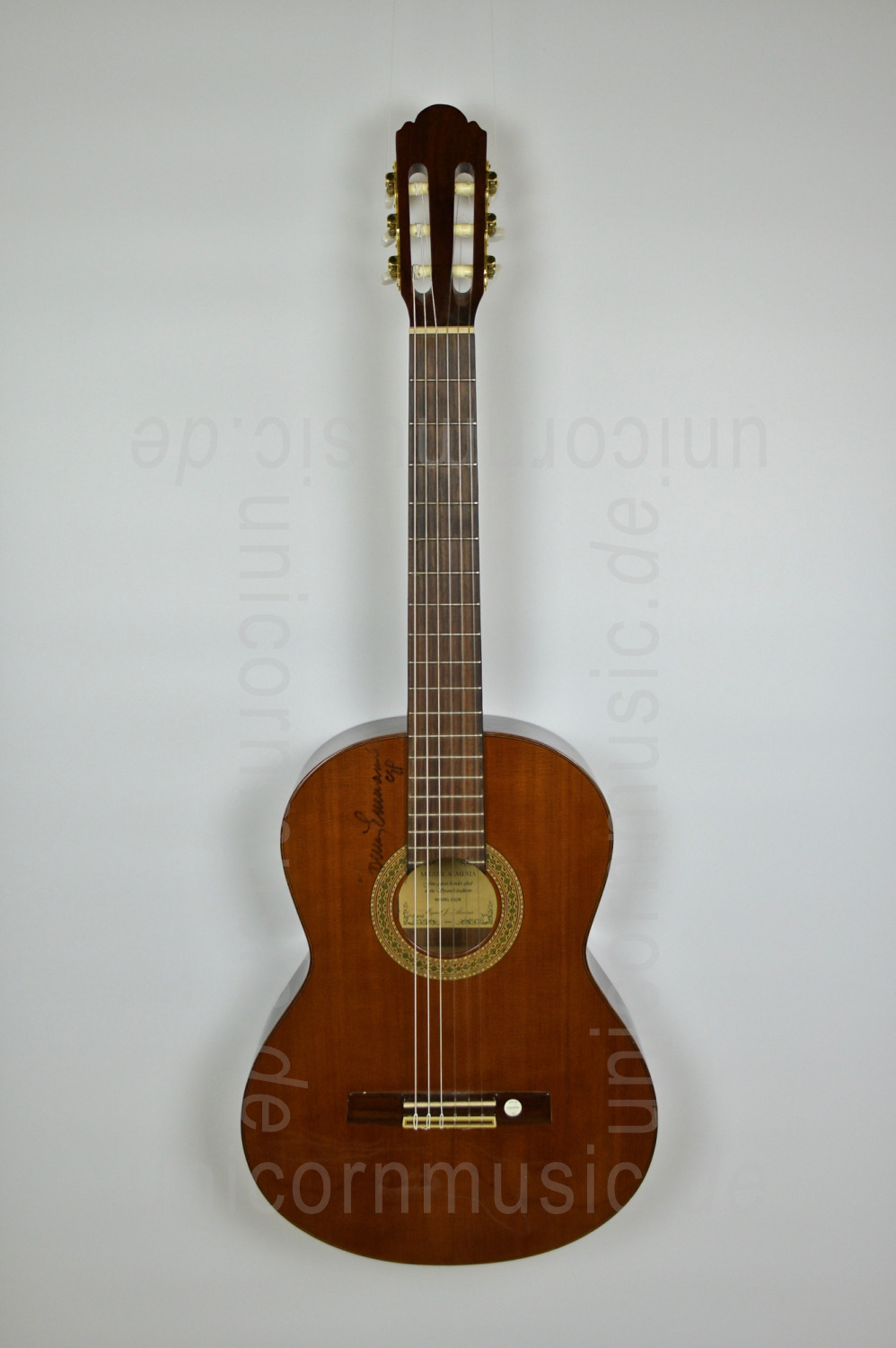 Diese Gitarre wurde 2015 von Tommy Emmanuel bei einem Konzert in Mannheim signiert. Tommy ist ein australischer Gitarrist, Songwriter und Sänger, der vor allem für seine komplexe Fingerstyle-Technik, seine energetischen Darbietungen und die Verwendung perkussiver Effekte auf der Gitarre bekannt ist.