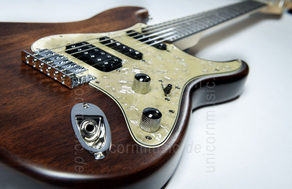 Das Basismodell von Old Whisky überrascht durch seine, in dieser Preisklasse ungewöhnlichen, ausgeprägten Klangeigenschaften. Die verwendeten Single Coils erzeugen einen warmen dynamischen Druck, der nichts - an der ST typischen Spritzigkeit - vermissen lässt. Für Verstärkereinstellungen mit High-Gain steht ein druckvoller Humbucker bereit. Dieser lässt sich je nach Bedarf auch splitten. Der glockig klingende Mahagoni-Korpus verleiht Old Whisky nochmals eine zusätzliche Portion Wärme. Für das nötige Sustain sorgt der bewusste Verzicht auf ein dämpfendes Tremolosystem und das direkte Aufhängen der Saiten im Korpus (String-Thru-Body). Das Ebenholzgriffbrett verleiht dem Instrument ein hohes Maß an musikalischer Trennschärfe und Leichtigkeit (Obertöne), wie es mit einer anderen Holzart kaum zu erreichen wäre. Insgesamt klingt Old Whisky sehr stratig und warm. Die Bässe sind druckvoll und