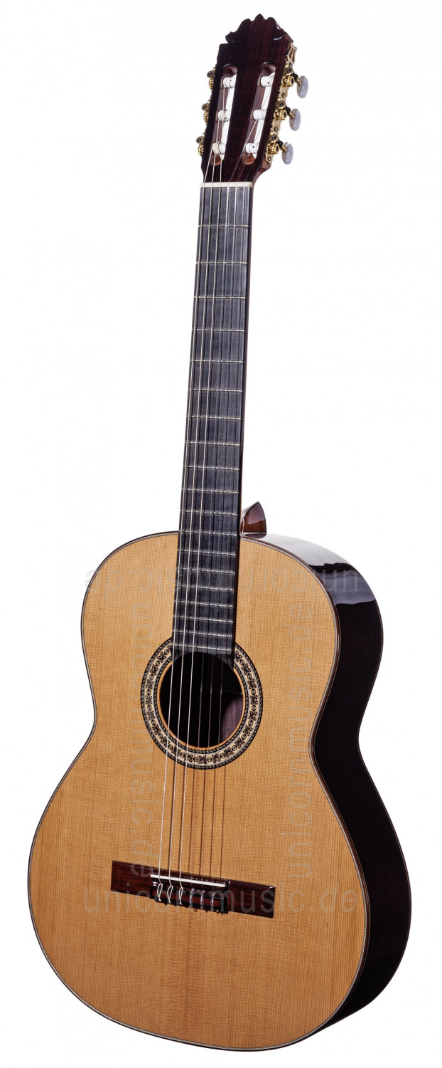 JOAN CASHIMIRA und ist das günstigste von etwa 4 Meistermodellen. Bei dieser Gitarre kommt für die Zargen und den Boden massives ostindisches Palisander-Holz zum Einsatz. Die massive Zeder-Decke der Gitarre ist leicht gewölbt (typisch spanische Bauweise). Im Vergleich zur flachen Bauweise lassen sich gewölbte Decken und deren Innenbeleistung bei gleicher Belastbarkeit deutlich dünner ausarbeiten, wodurch Gewicht gespart werden kann. Eine leichte Decke führt zu einer schnelleren Ansprache, einer sehr kurzen Reaktionszeit, höherer Lautstärke und deutlich besserer Dynamik. Die CASHIMIRA 2A Zeder besitzt eine blitzschnelle Ansprache, klingt enorm druckvoll, voluminös und dennoch sehr spritzig. Die Höhen sind klar, brillant uns sehr warm. Der Dynamikumfang ist phänomenal. Der elastisch wirkende singende Ton erinnert bildlich gesprochen an ein räumliches 3D Erlebnis. Bei all diesen Eigenschaften eignet sich dieses Instrument bereits auch für ein Musikstudium eines angehenden Profis.